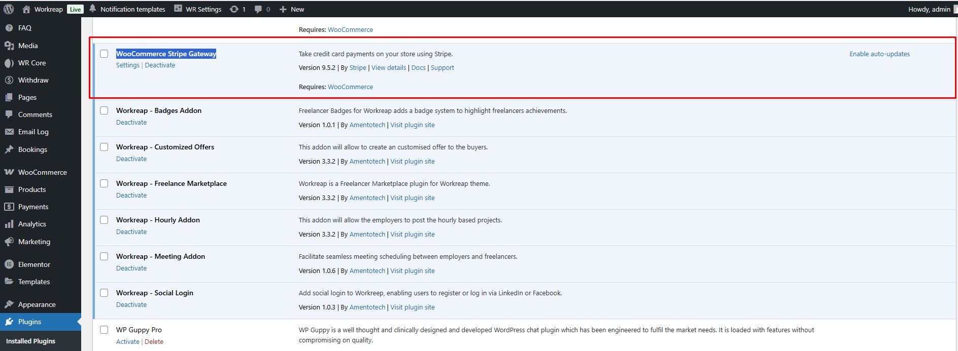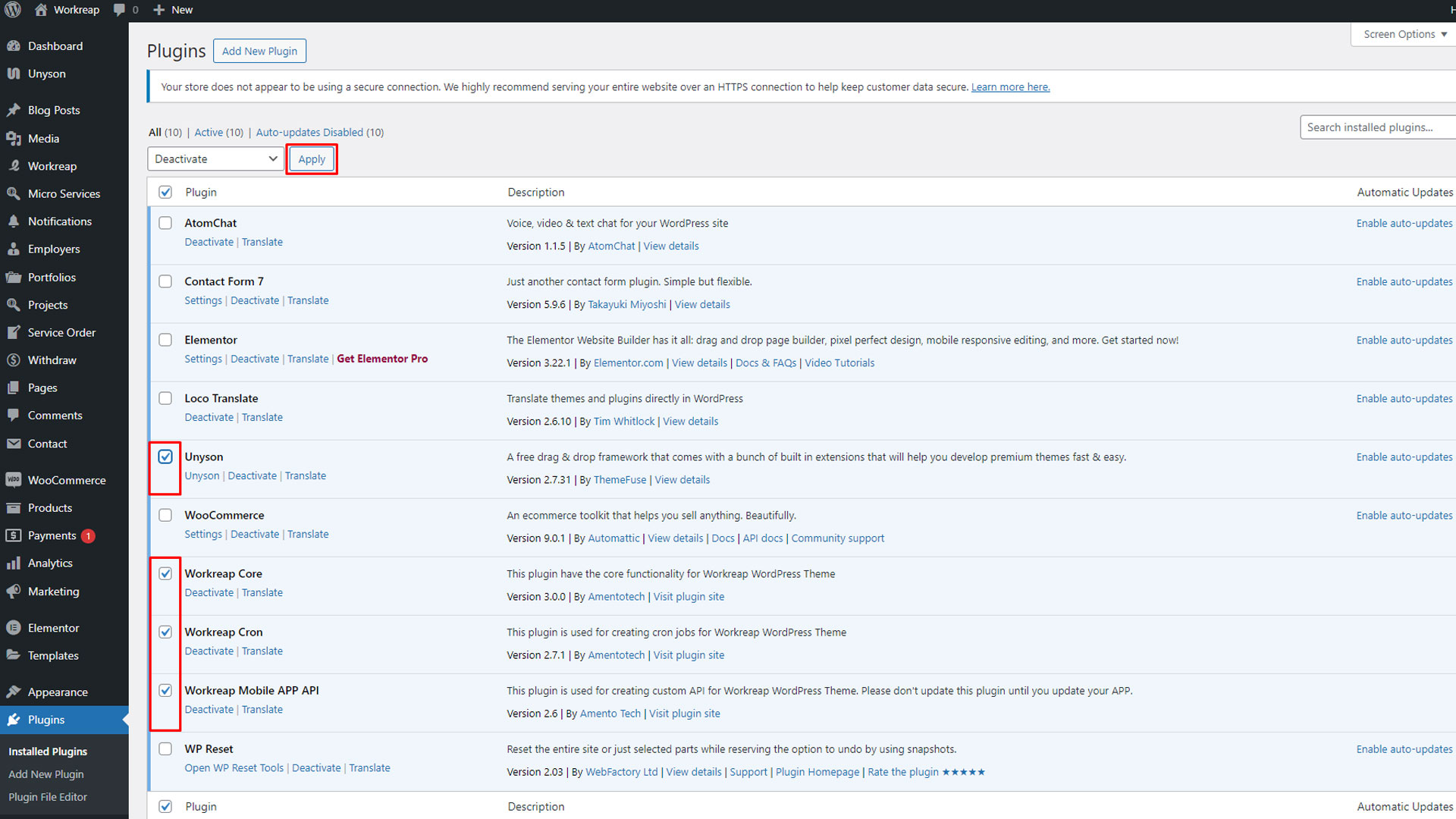 Step 4: Now, after all the plugins and the theme are updated and activated, navigate to WP Administrator > Plugins and deactivate the Unyson, Workreap Core, Workreap Cron, And Workreap Api plugins.