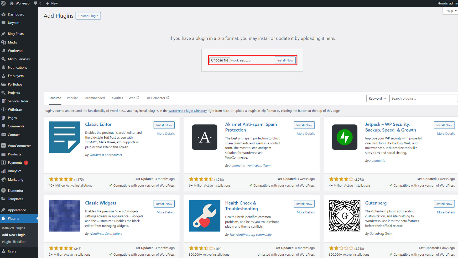 Step 5: Now, after deactivating the old plugins, you need to install and activate our Workreap plugins. You will find these plugins in the "plugin" folder within the downloaded zip file. Extract them from there and proceed with the installation.