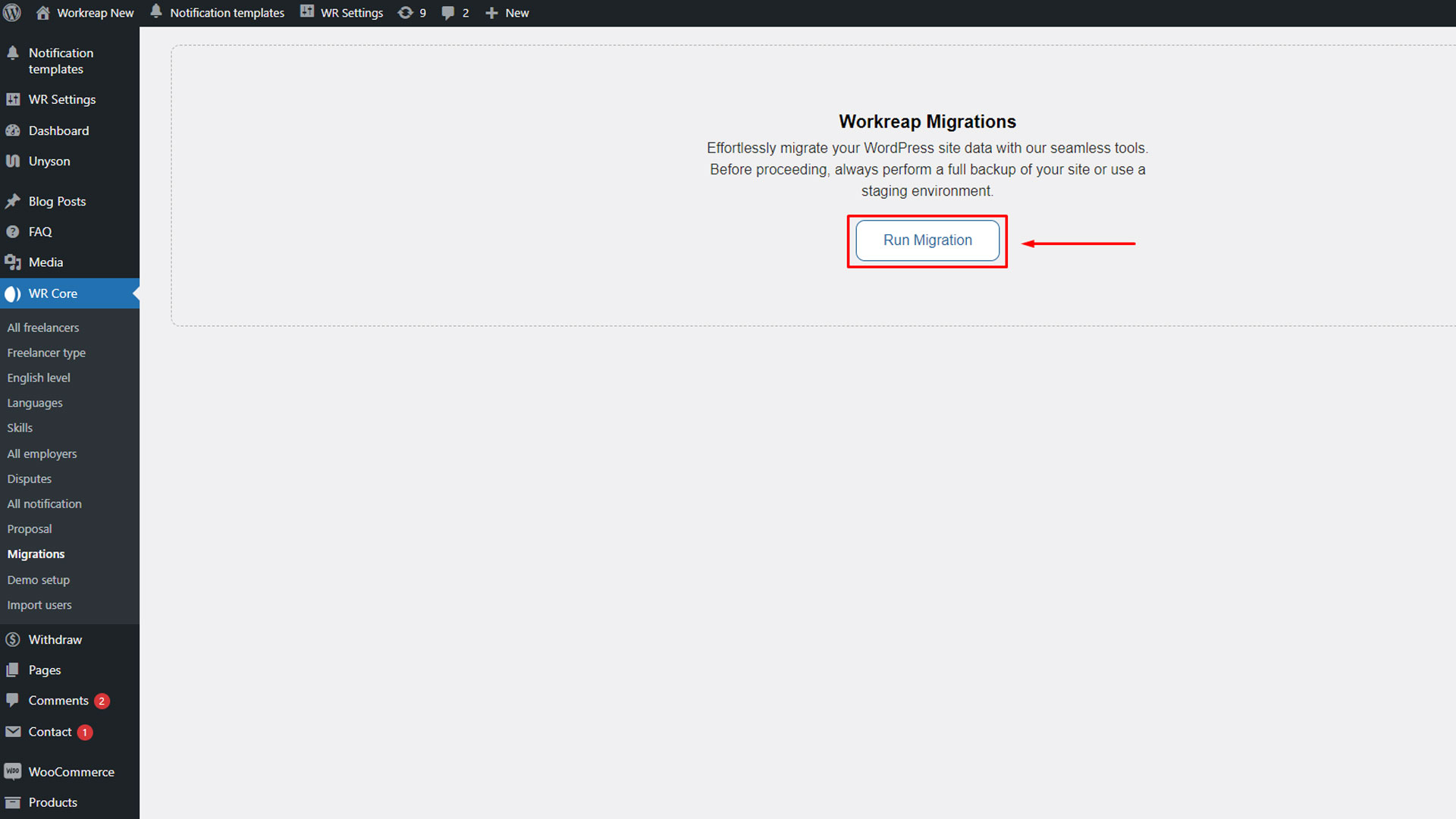 Step 8: Now, after all the plugins and the theme are installed and activated, navigate to WR Core > Migrations and run the migrations. This process may take some time. After the popup disappears, the migration will be completed, and you can enjoy the new Workreap theme.
