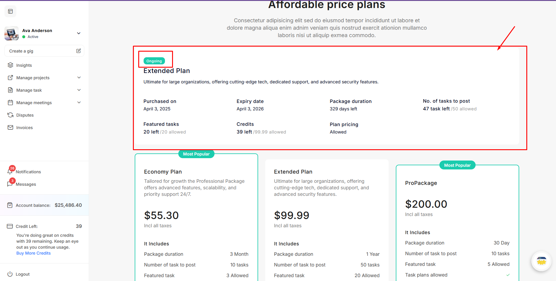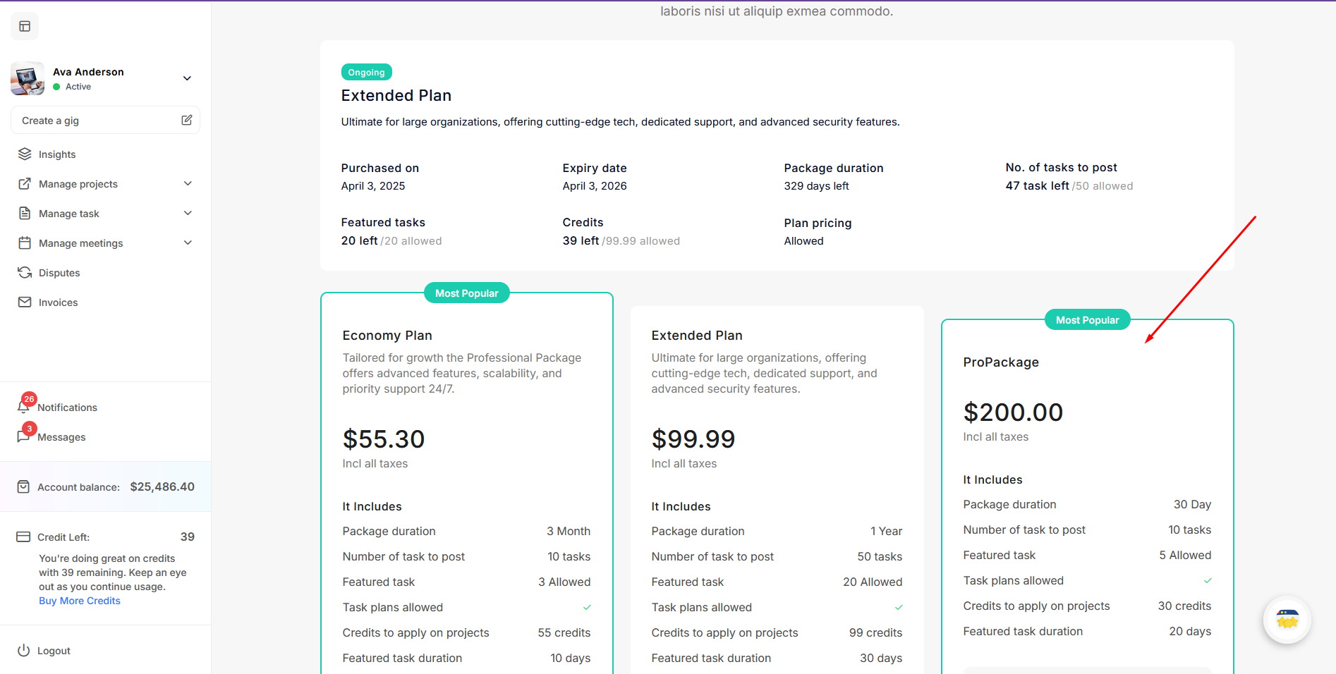 If a user purchases any package, it will be displayed at the top of the packages list on their dashboard.