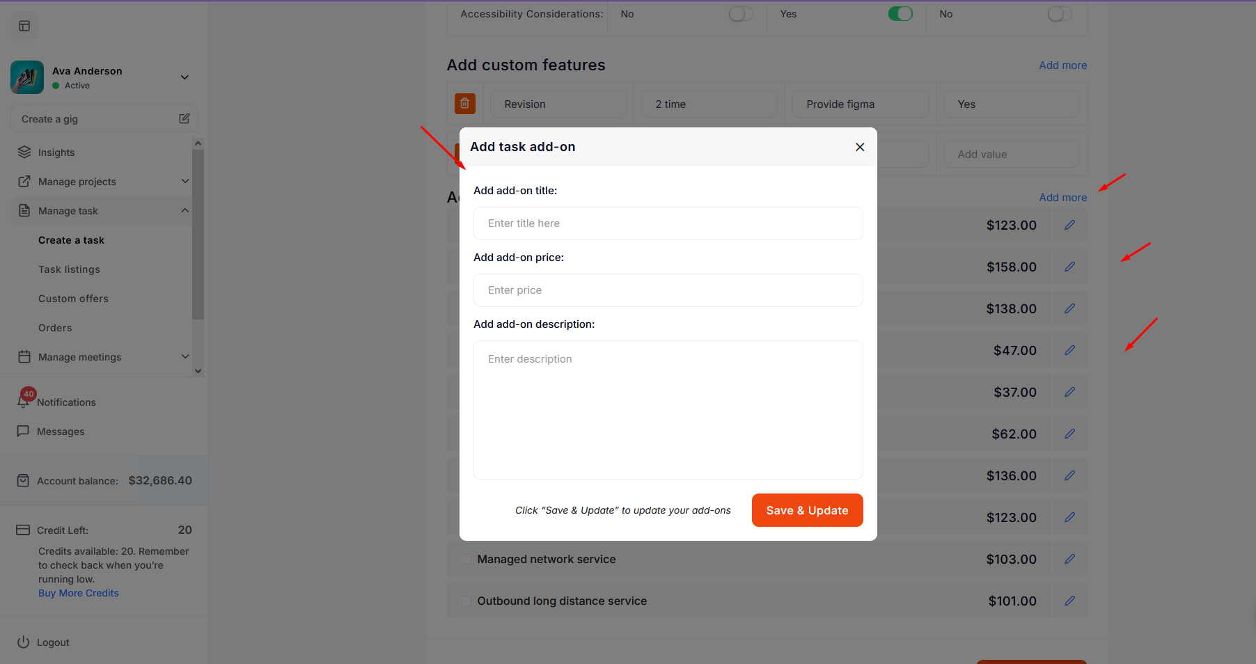 The freelancer can choose existing add-ons or create multiple new add-ons. After that click on Save & update button.