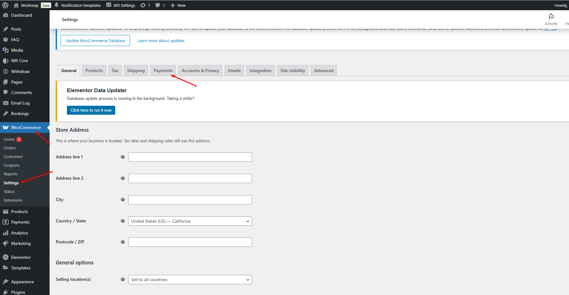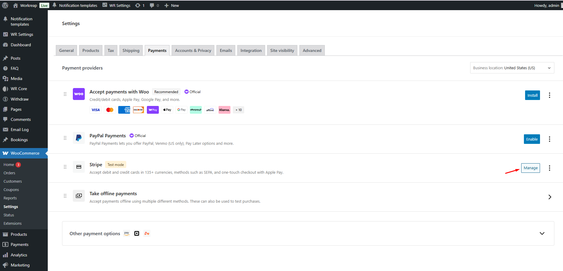 After installing the Stripe plugin, go to WooCommerce -> Settings and select the Payments tab.