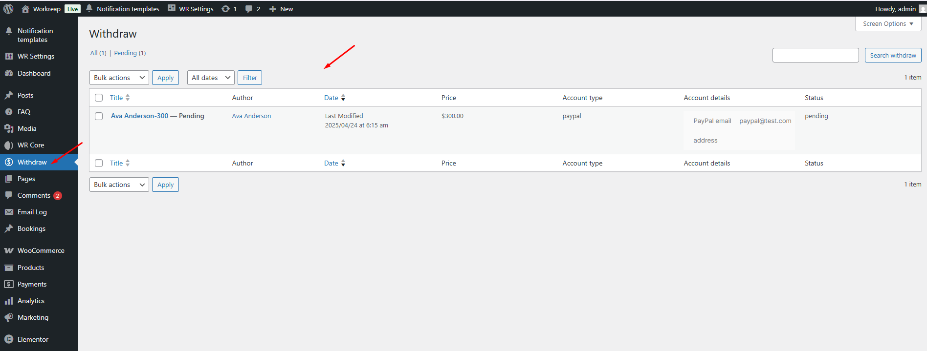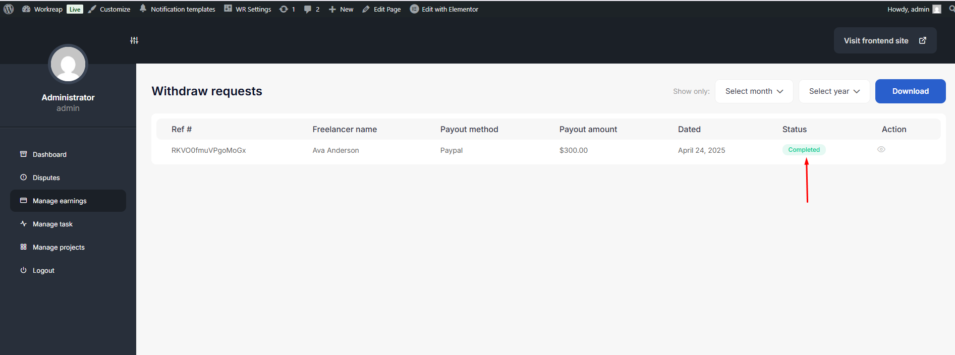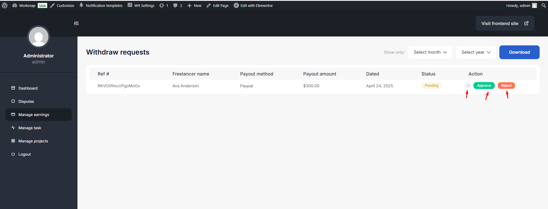 To Approve or Reject a withdrawal request, the admin goes to the front-end dashboard, where they can see all withdrawal listings.