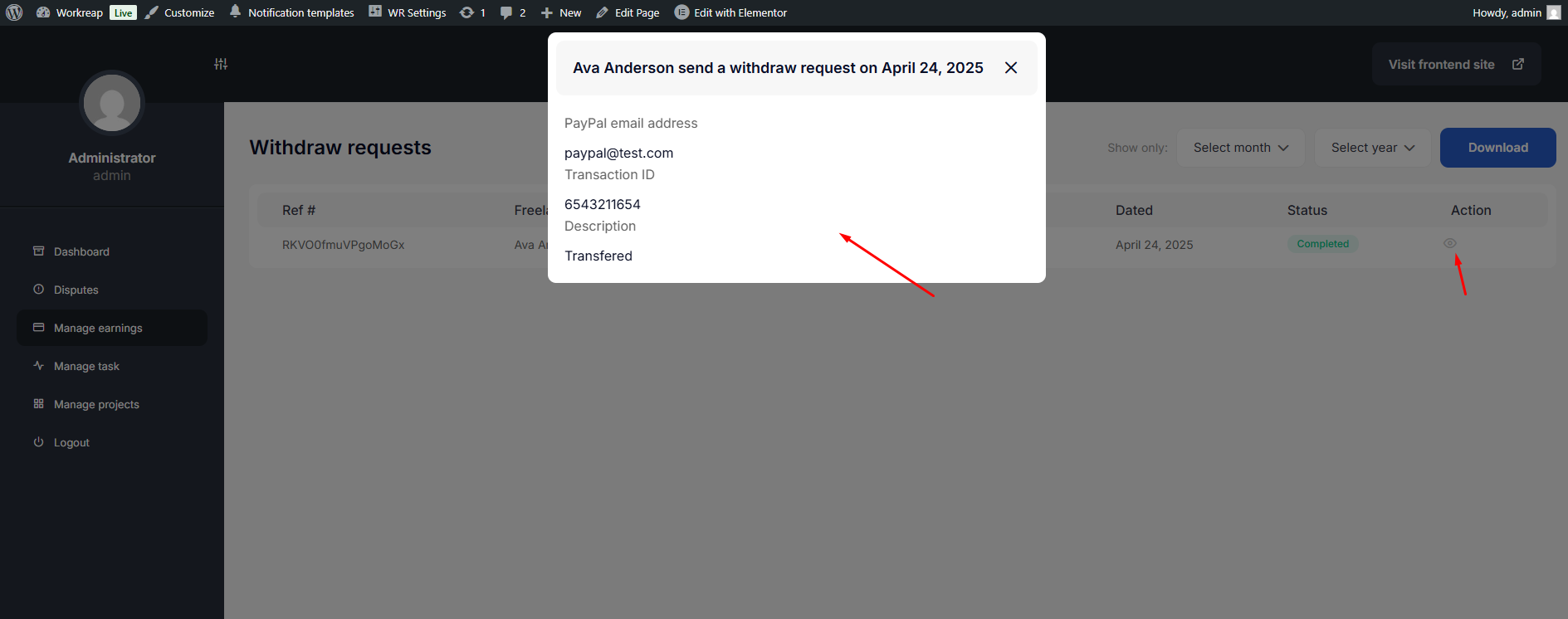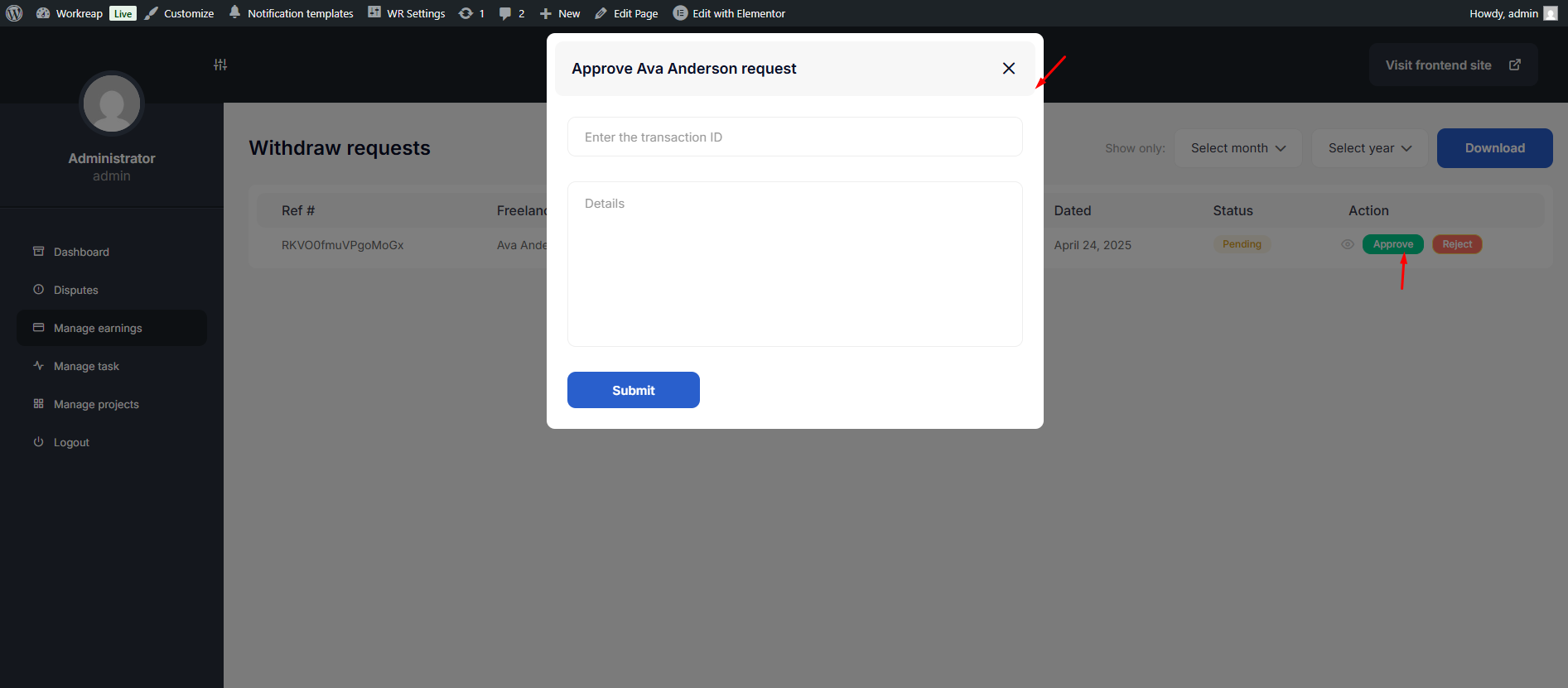 The admin manually transfers the money to the freelancer's account according to the withdrawal request. After that, the admin clicks the Approve button and add the Transaction ID and some details.