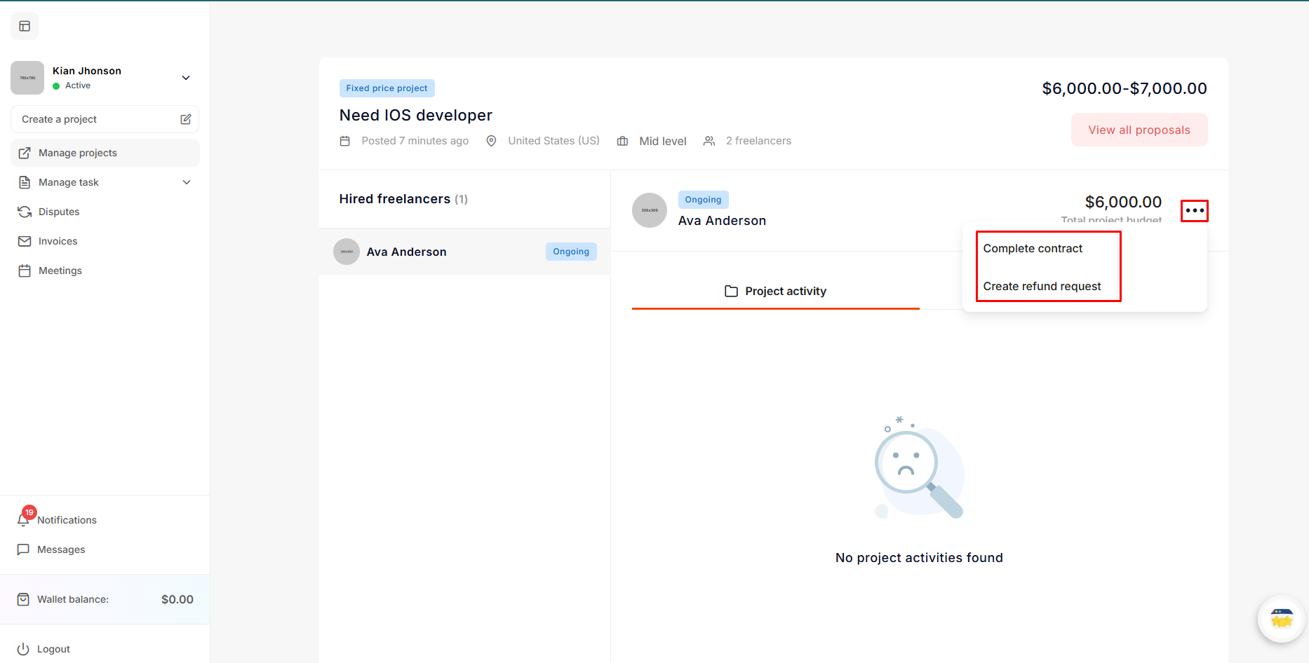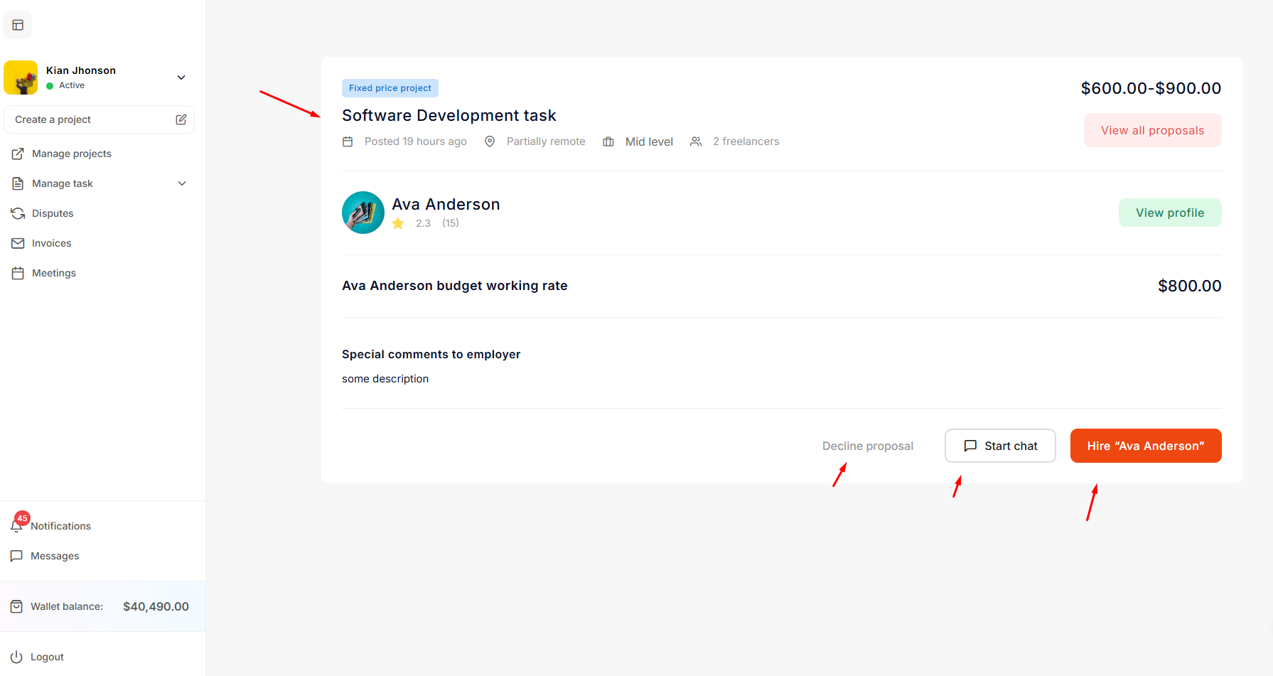 - Start Chat: The employer can communicate with the freelancer before accepting their proposal.