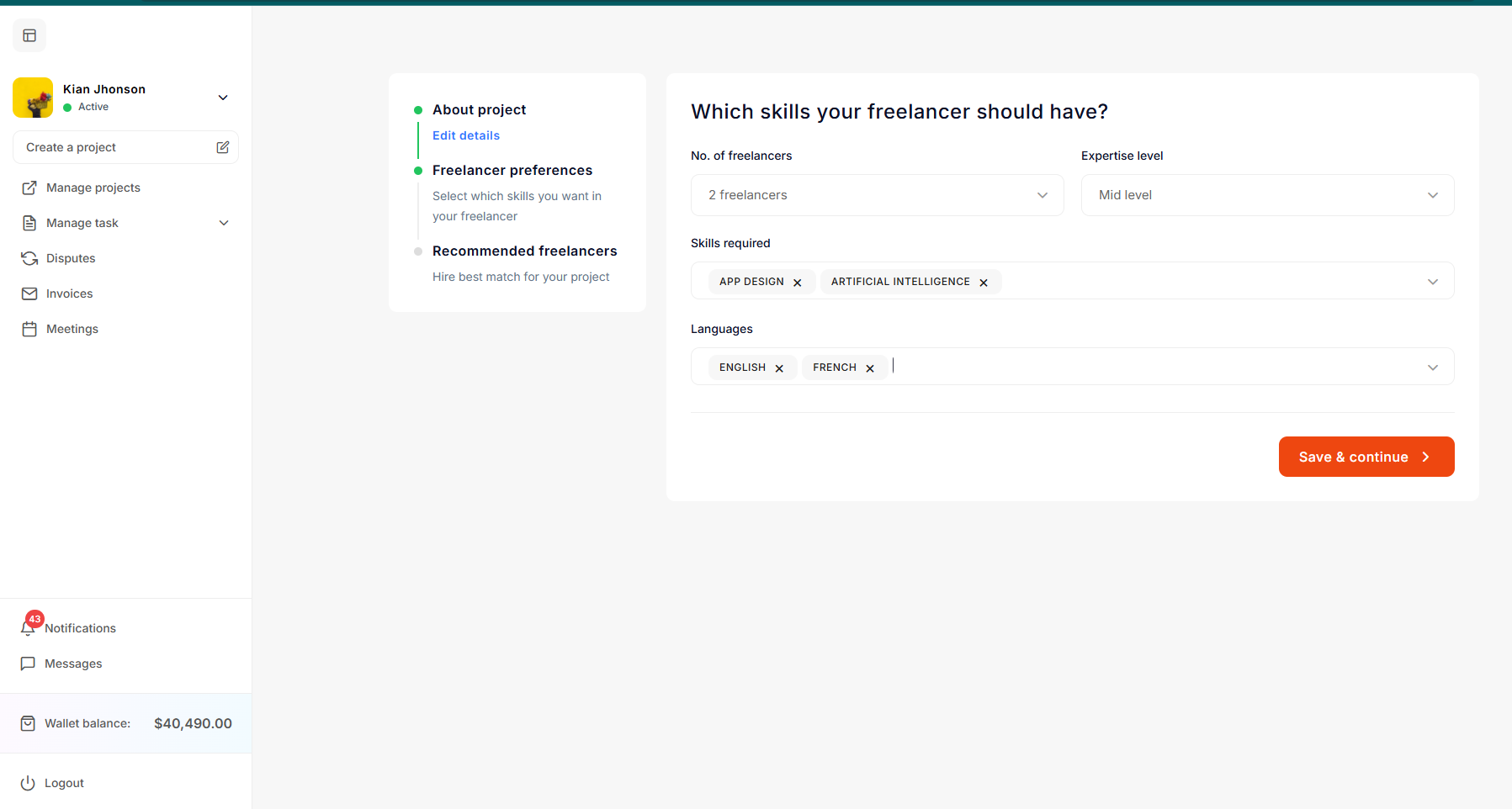 On that screen, the employer can update other information, such as how many freelancers can be hired for this project, as well as expertise, skills, languages, etc. After filling the fields click on Save & continue