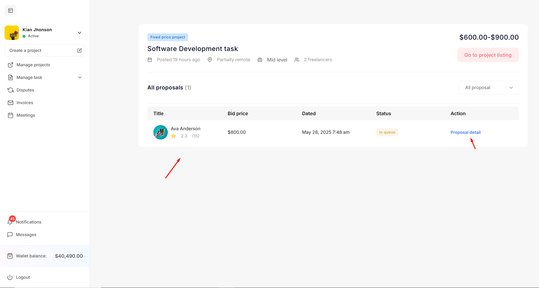 From the proposal listings, the employer can see the details of any freelancer's proposal after cliking on Proposal detail button.