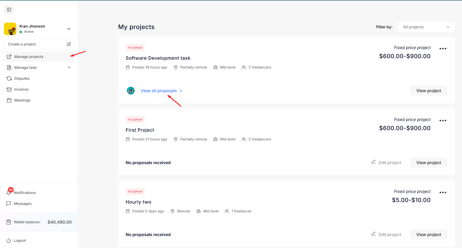Once the proposal is submitted by the freelancer, the employer can view the proposals by clicking on "View All Proposals."