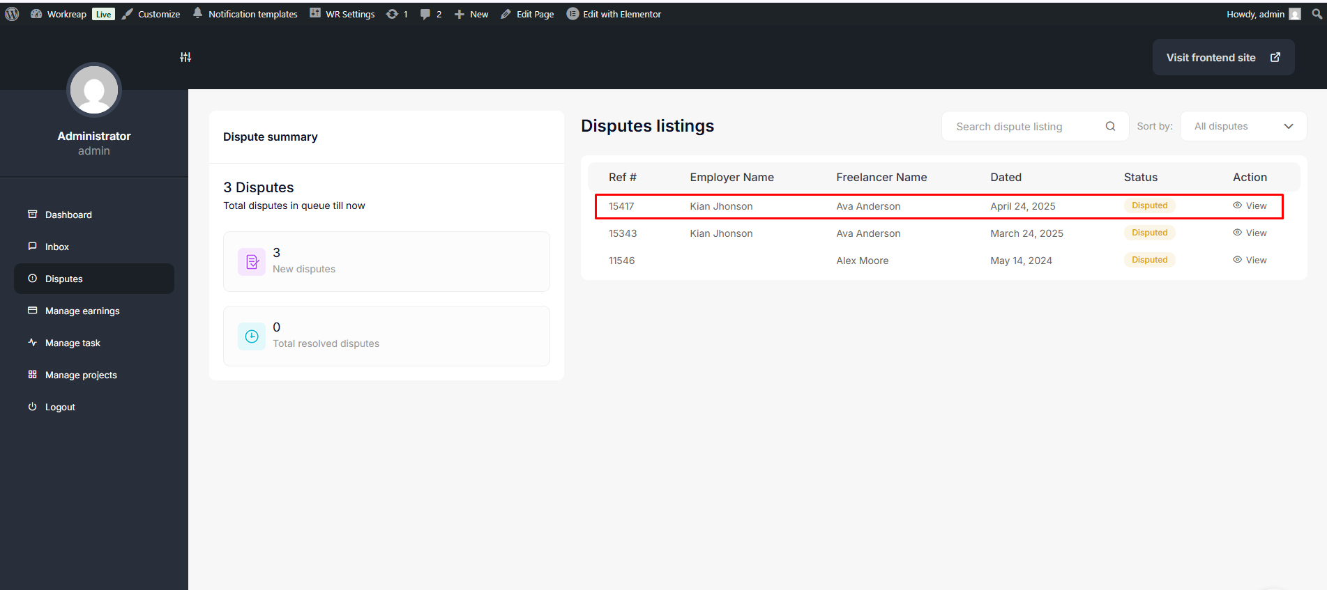 On the admin dashboard, the admin can view the list of created disputes along with their details. Within the dispute details, the admin can message both users and determine the winning party based on their discussions.
