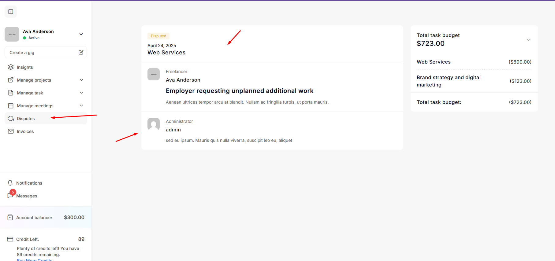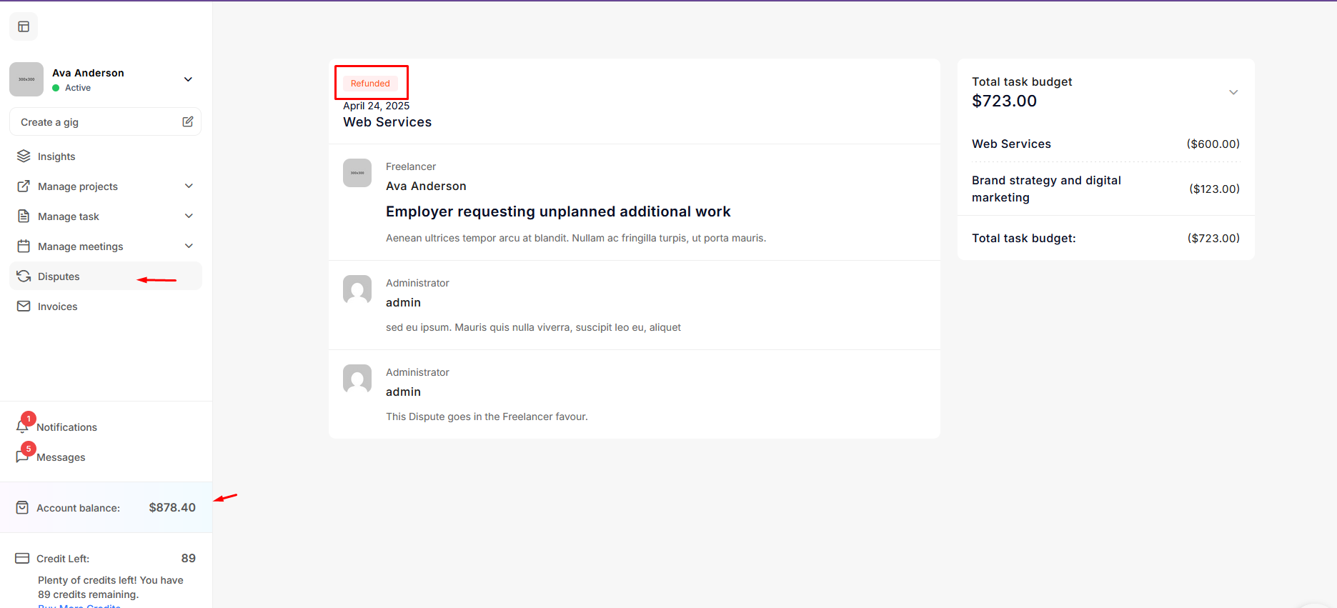 Since the dispute was resolved in favor of the freelancer, the amount is updated in his account. He can view the dispute details under the dispute menu.
