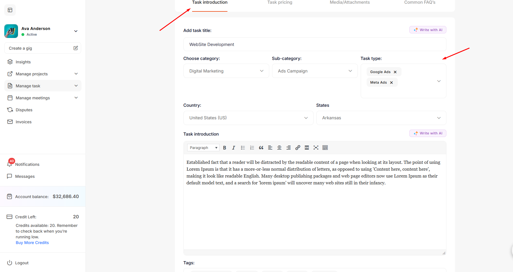 After choosing the Task Type in Task Information and filling in the other details, the freelancer clicks on Save & Continue.