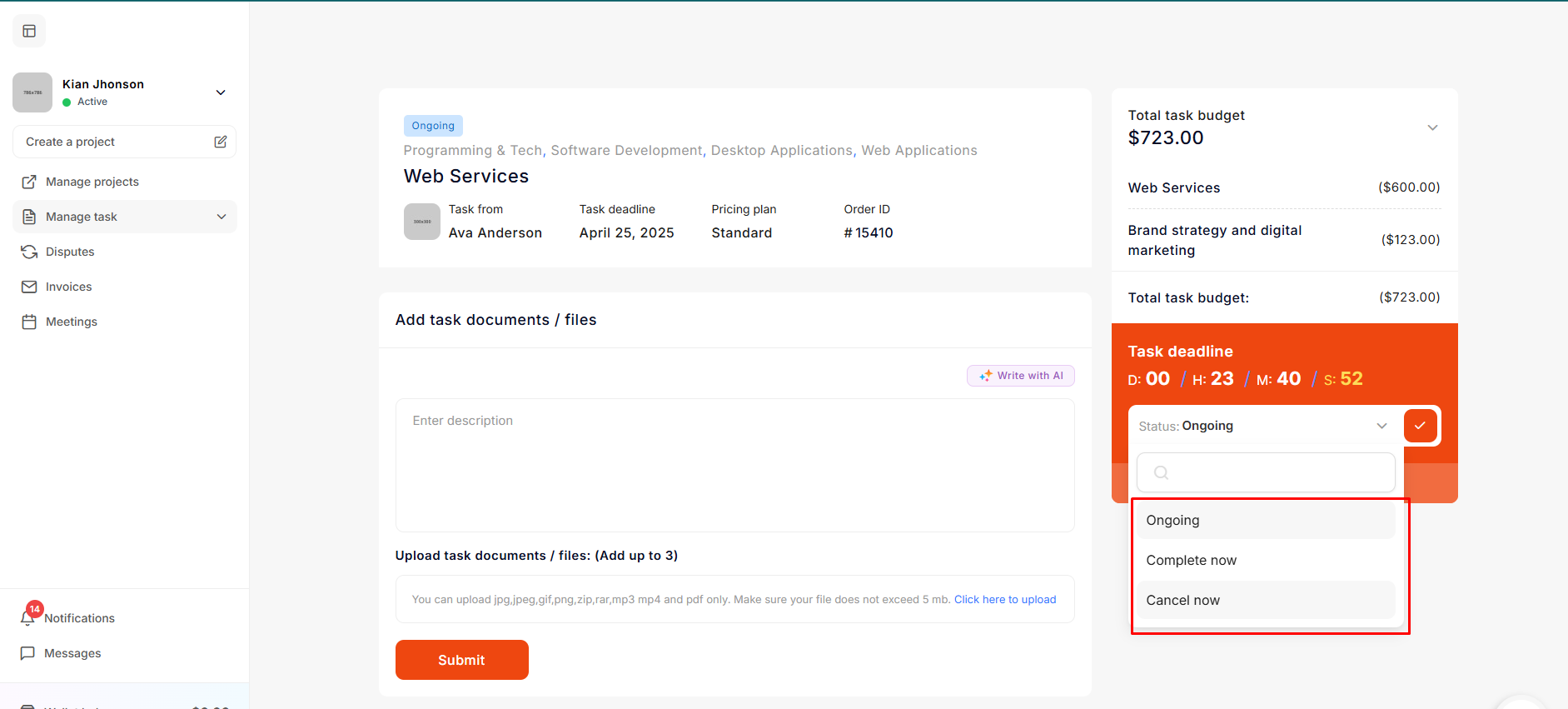 The employer cancels the task from the dropdown while a dispute has already been created. Once the employer cancels the task, communication section will no longer be available for both users.