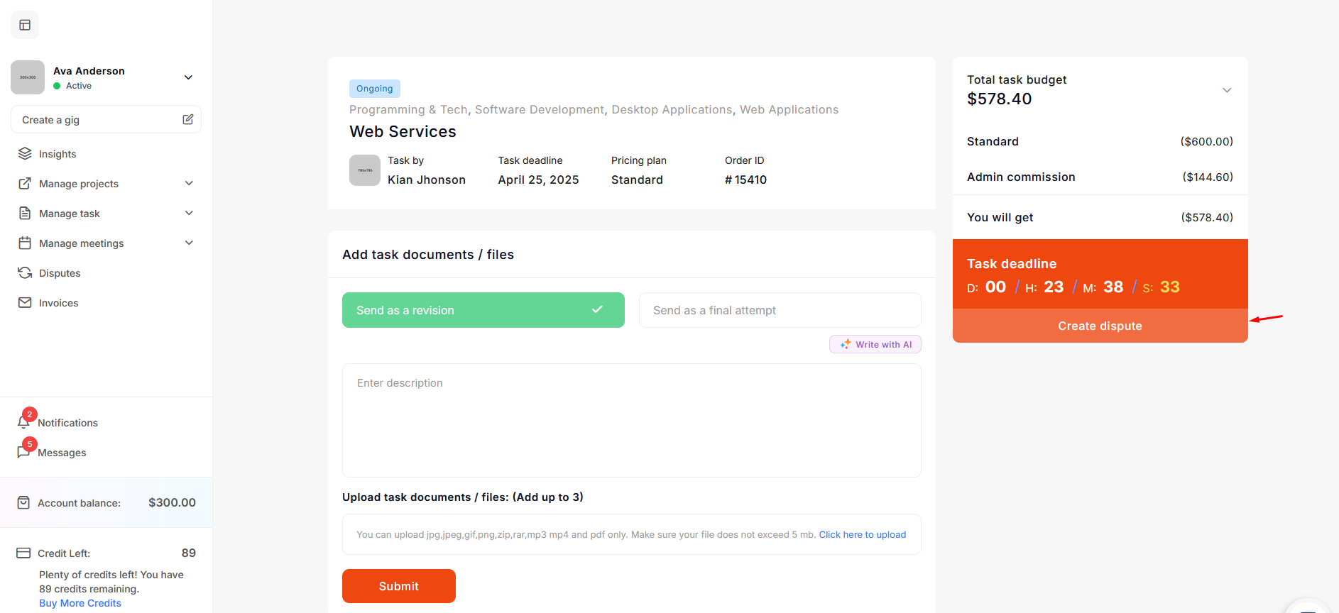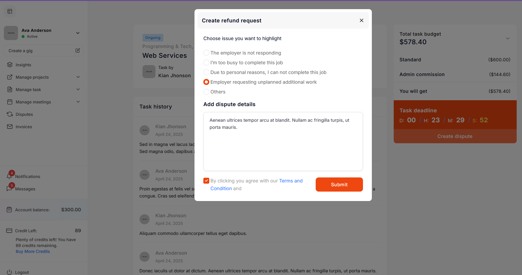The freelancer clicks on Create Dispute and fills out the form to submit a refund request. The freelancer's dispute request goes directly to the admin.