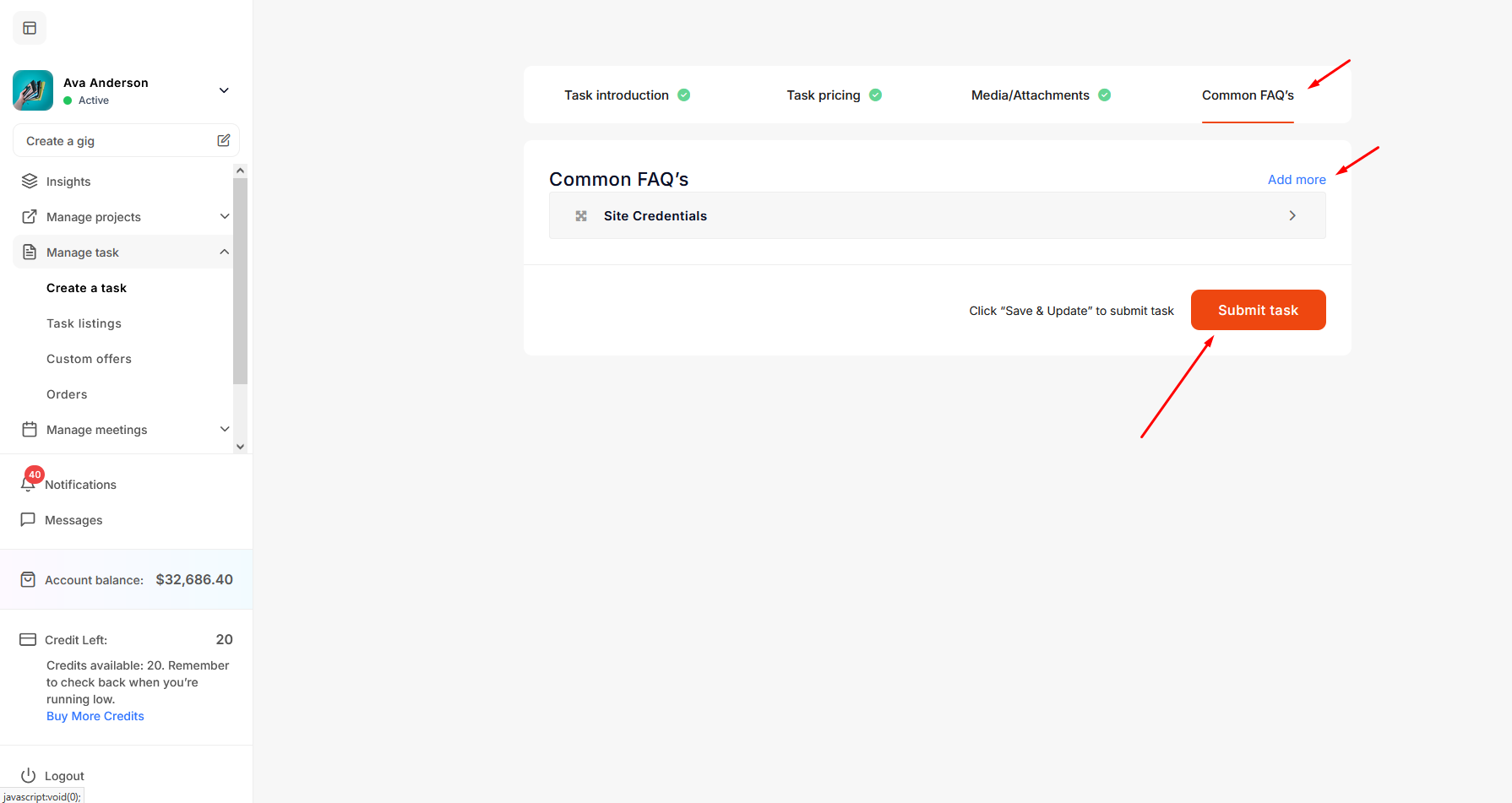 On the Common FAQs screen, the freelancer can add common FAQs if they have any. And click on Submit task button.