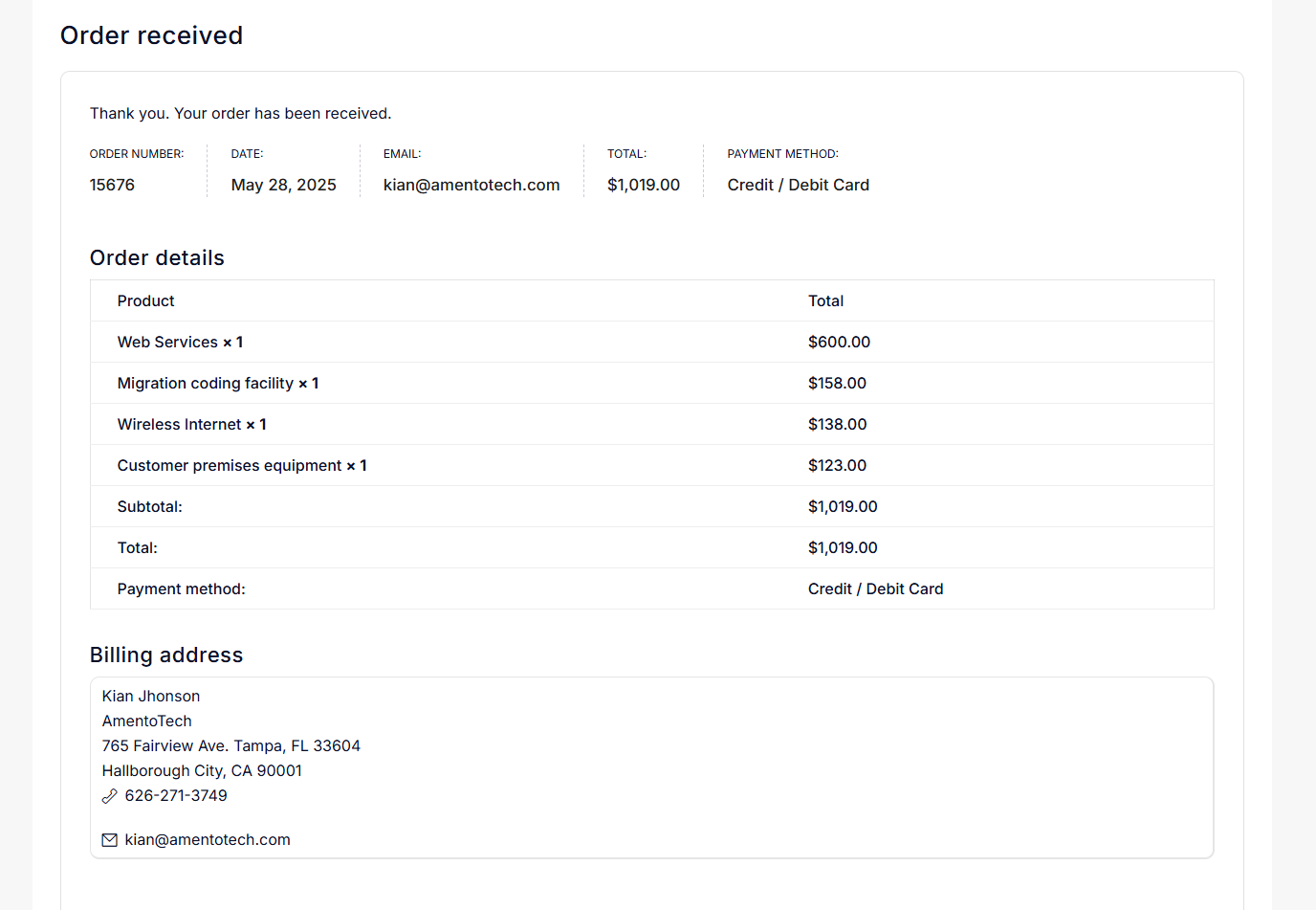 After the order placement process is complete, the WooCommerce thank you page will load, where the employer can also see their order details.