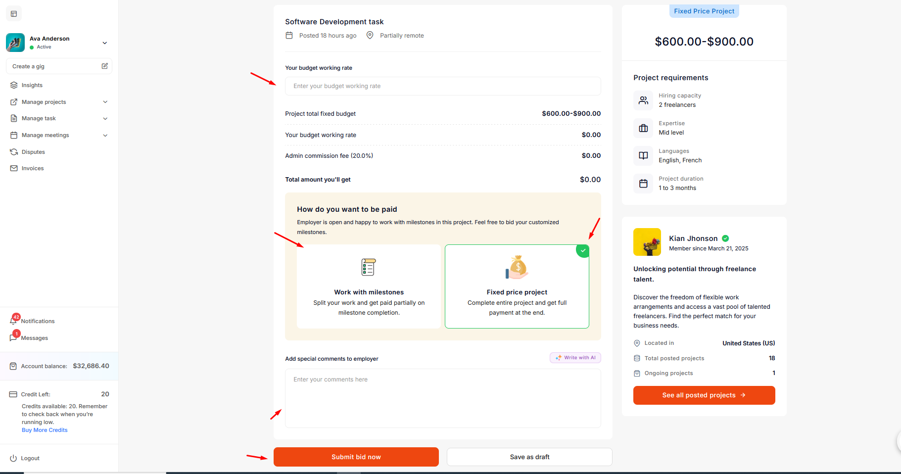 Here, the freelancer enters their working rate and chooses other options, such as working with milestones or a fixed-price project. The "Work with milestones" option will only be shown if the employer has activated this option during project creation. After that, the freelancer should add a description and click on the "Submit bid now" button.