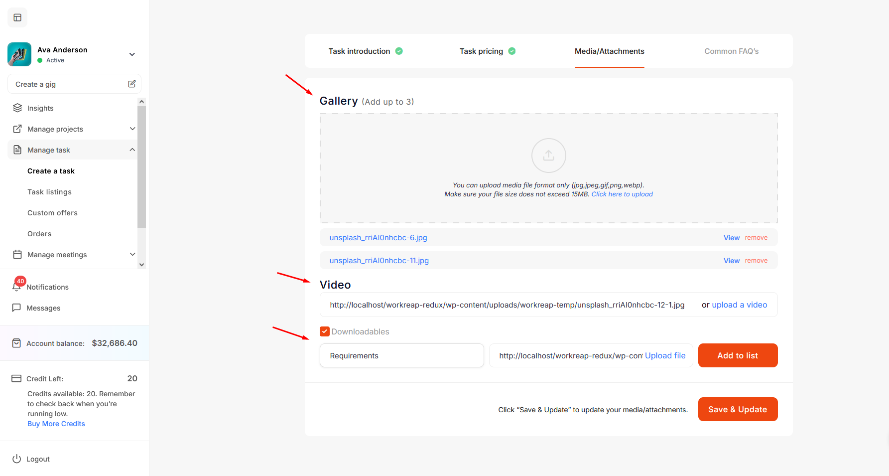 On the Media/Attachment screen, the freelancer can upload task-related media files. After that click on Save & update button