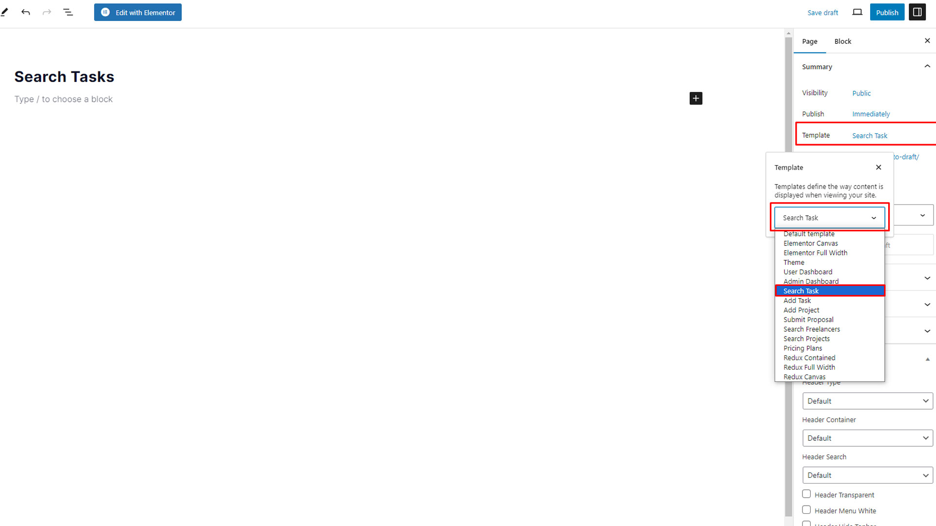 - Create an "Search Task" page, assign the "Search Task" template to it, and configure the template setting field accordingly.