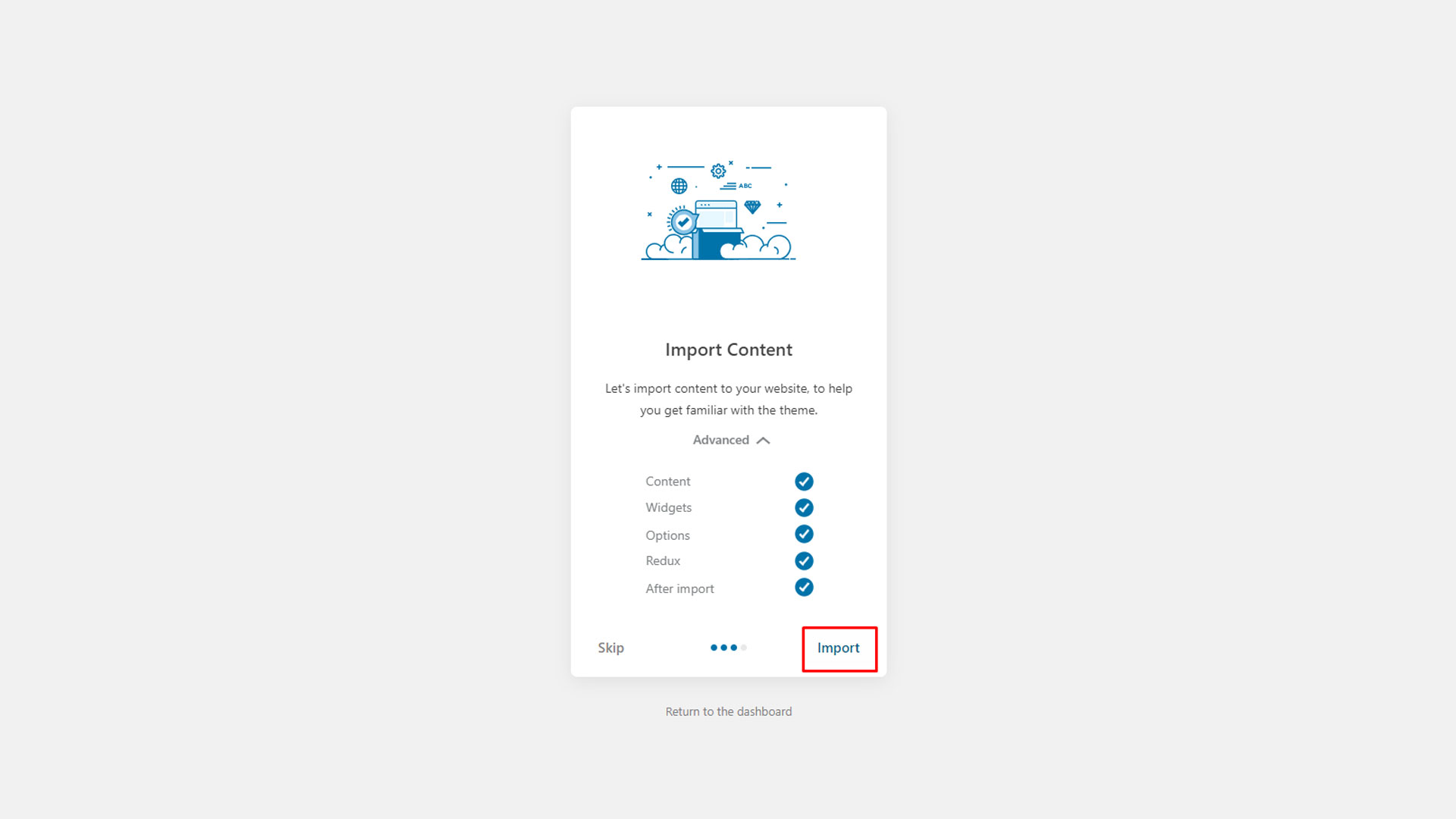 Step 4: After that, you can import the demo content for your site. Simply click the import button, and the demo content will be imported. This process may take some time, so please be patient while the setup is completed.