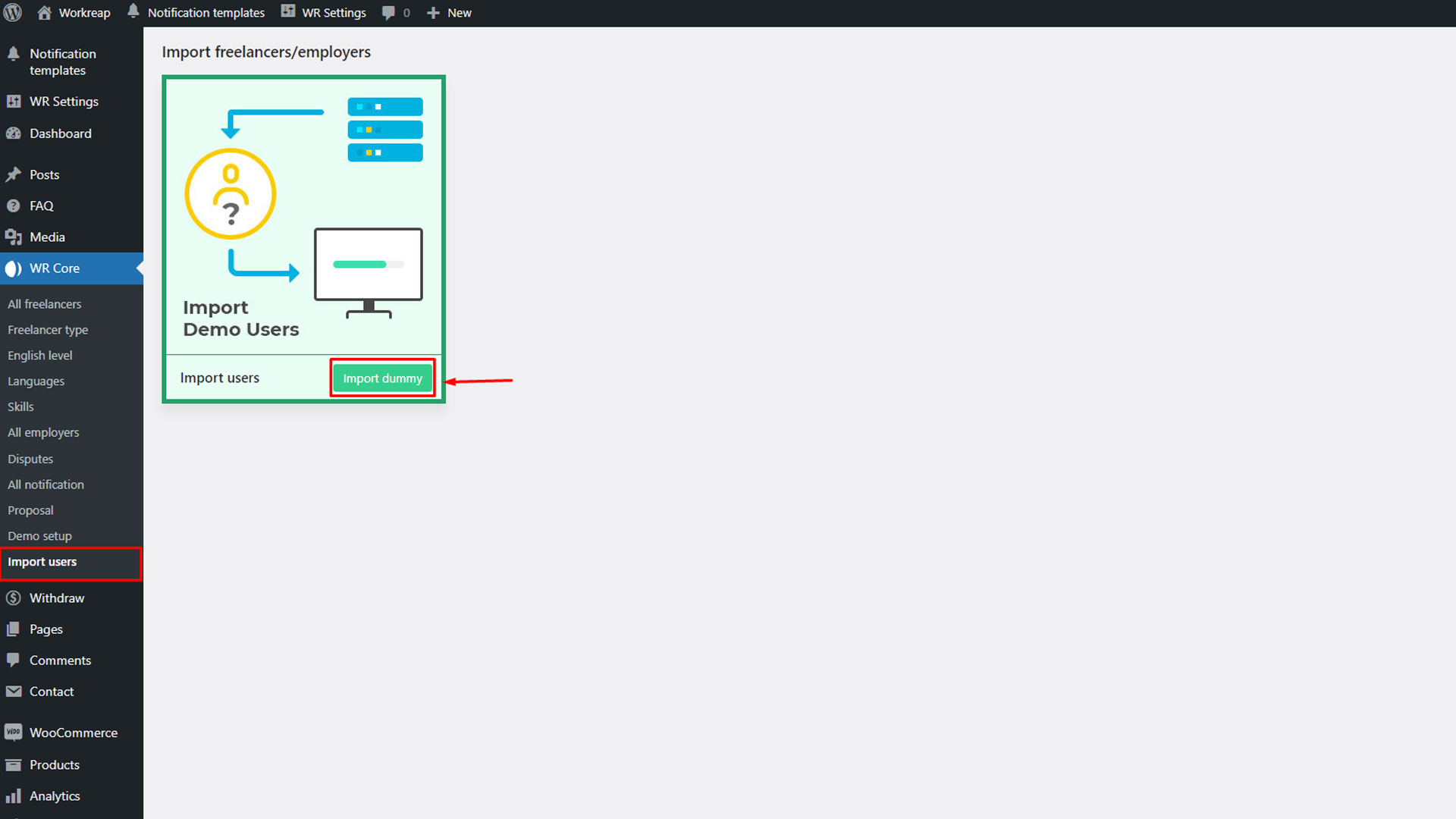 Step 6: To import dummy users, navigate to your WordPress administrator dashboard, then go to WR Core > Import User. Click on the "Import" button to import the demo users.