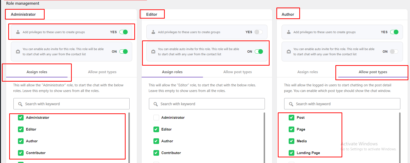 In general settings, you will see role management, where the admin can manage user chat roles with a few clicks.